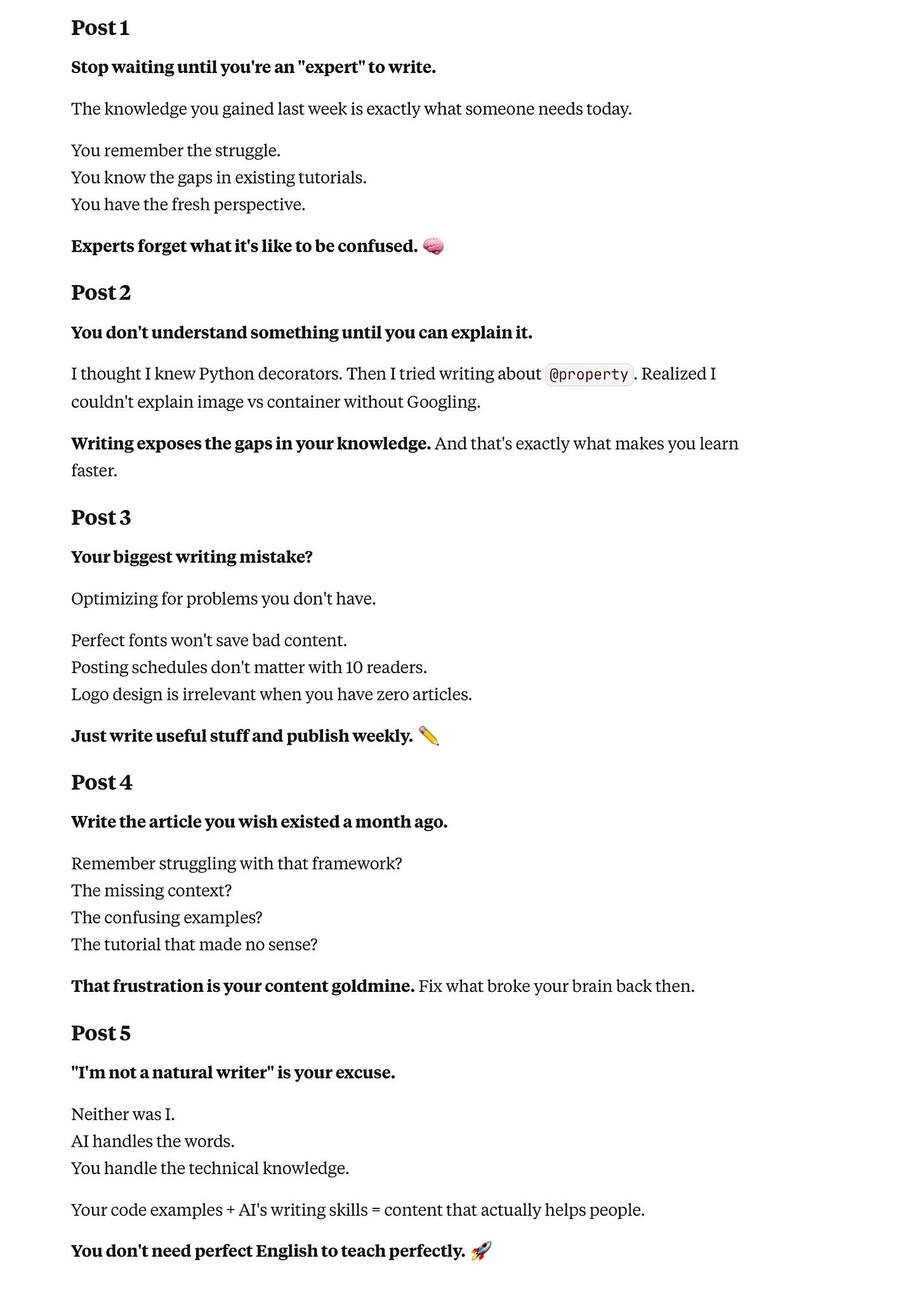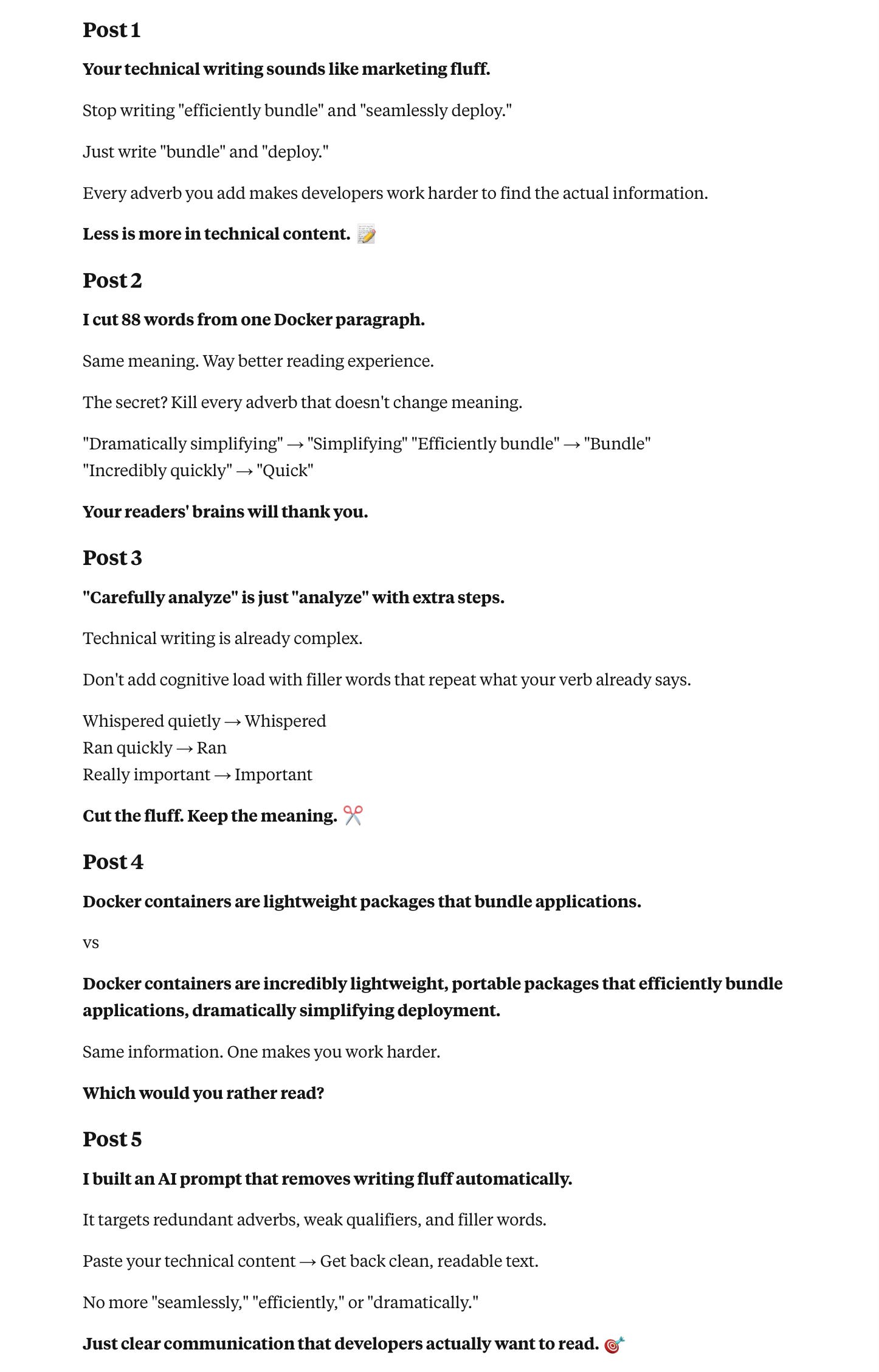 All it takes is one prompt. AI reads your technical content, extracts the key insights, and transforms them into short-form posts that actually get engagement.